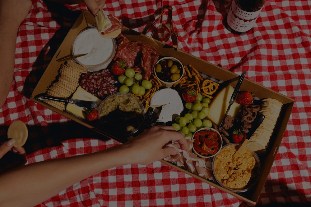 An elegant selection of prosciutto and Calabrese salami paired with creamy double brie and aged Manchego. Served with marinated olives, Semi dried tomatoes, sweet muscatels, and crisp water crackers. Finished with fresh grapes, strawberries, and a mix of classic and chocolate-dipped pretzels for the perfect balance of savoury and sweet.
